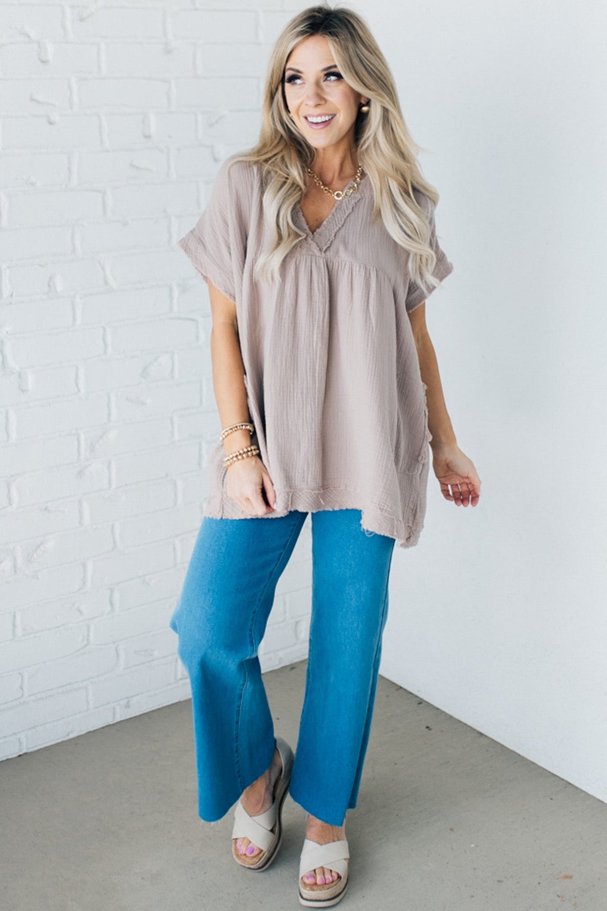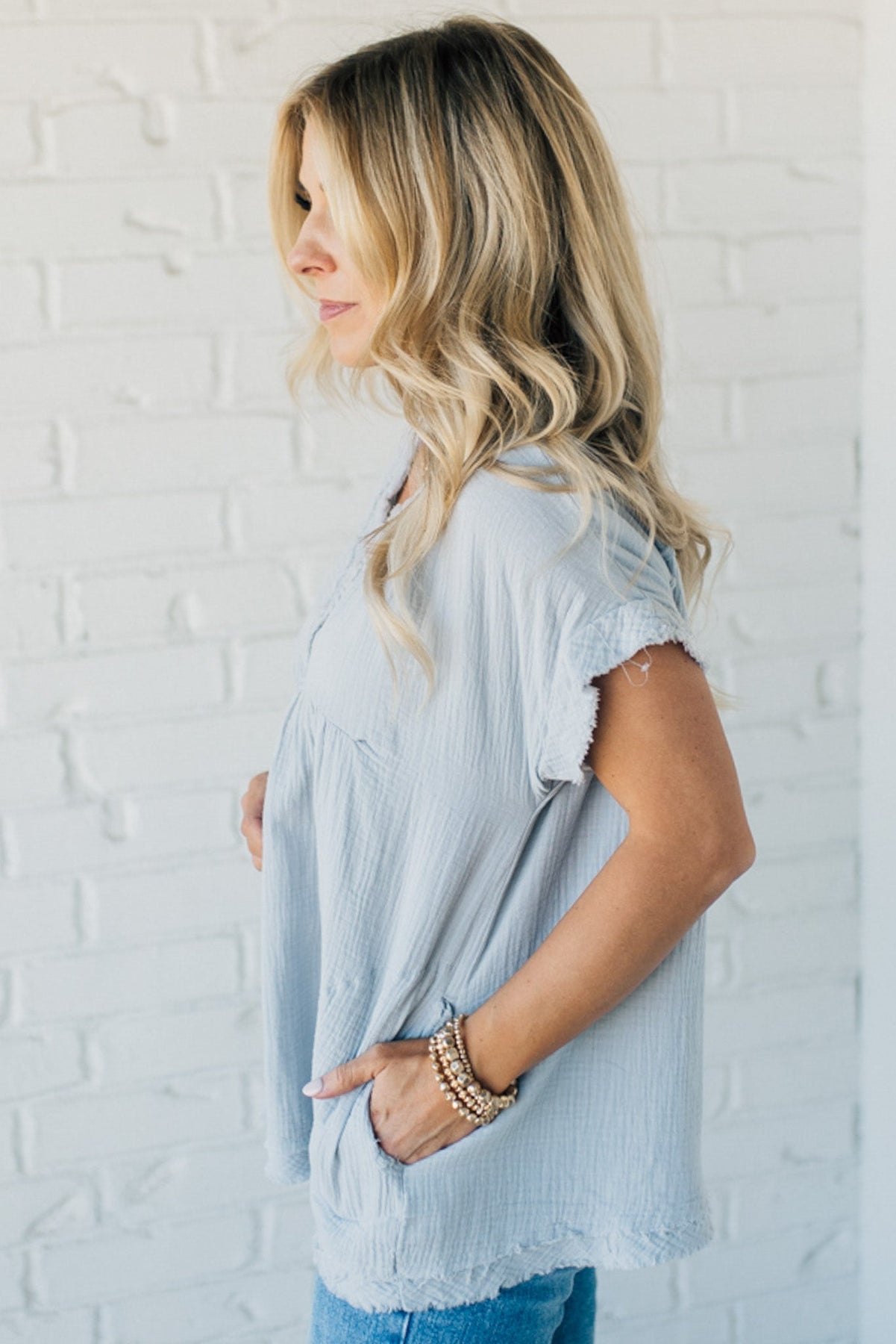 Lightweight gauzy top with a pocket on each side, and a raw edge, straight hem! This cozy top can be dressed up with jeans and booties, or throw her on with leggings and slippers for the perfect get-things-done look!
